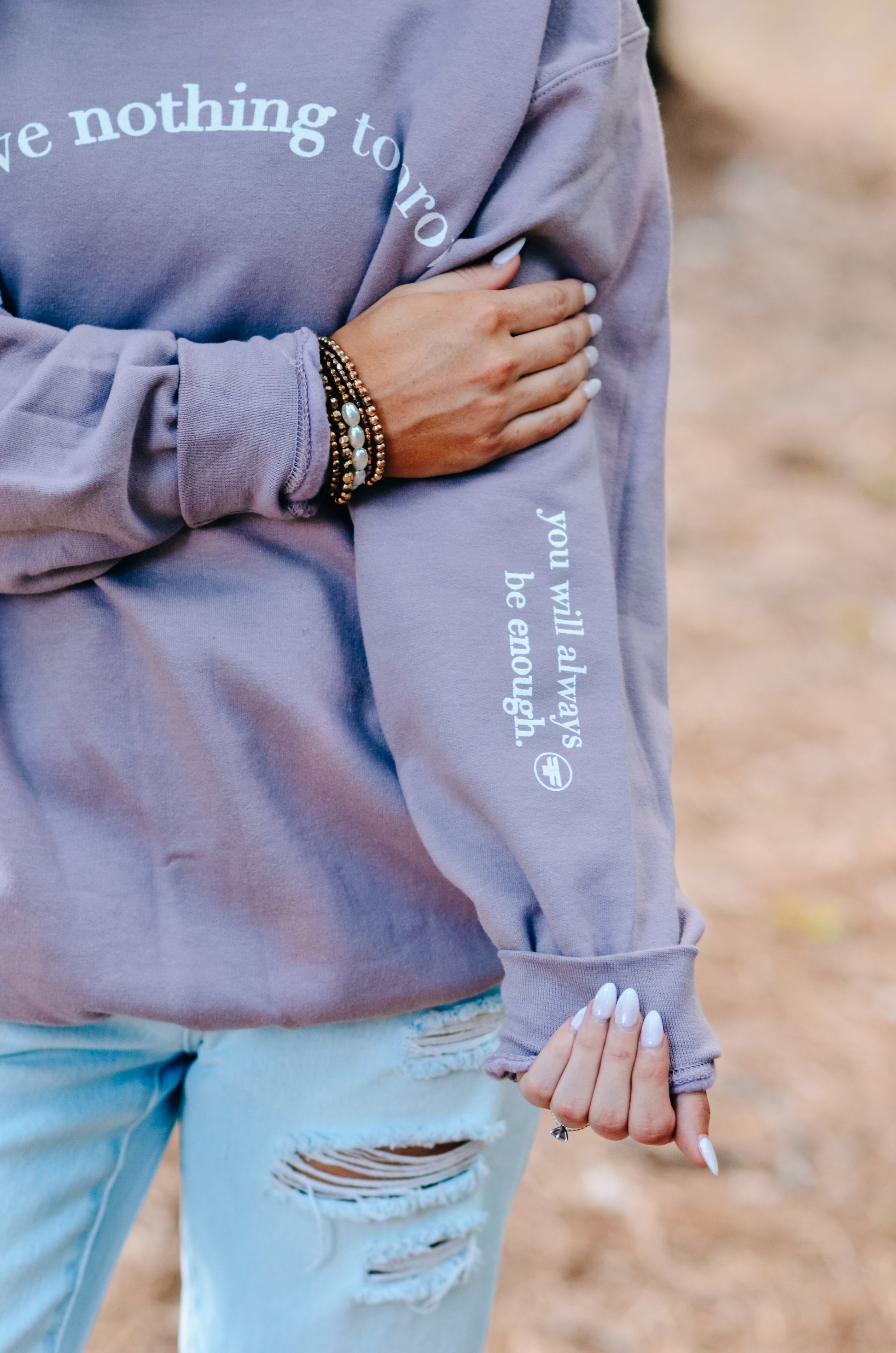 You have NOTHING to prove print on front in bold white. With a "self note" reading You will always be ENOUGH. The self note is a note for you to read when needed as a daily reminder.