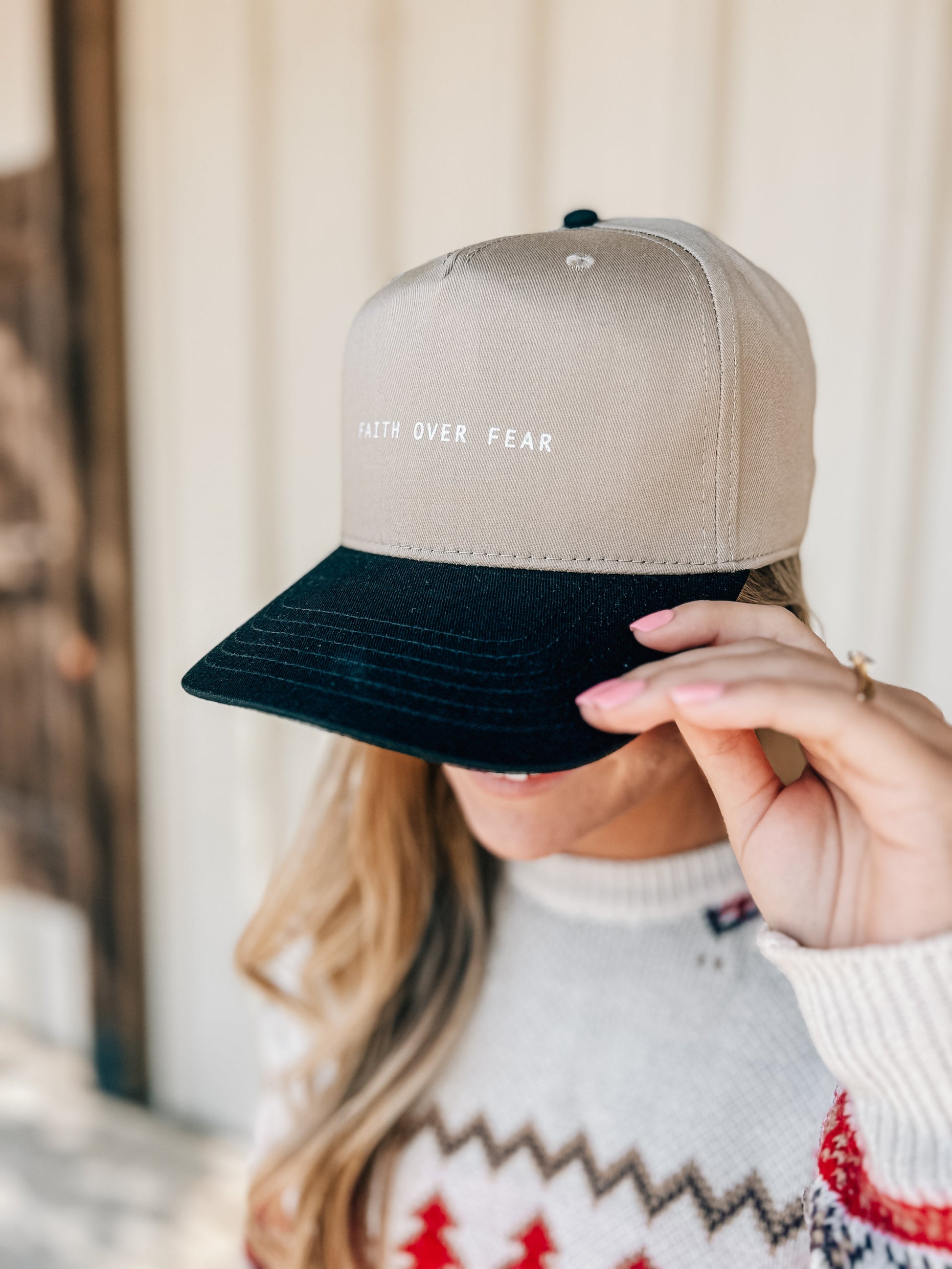 High quality canvas material trucker hat style, adjustable snap back. With our Faith Over Fear word mark print front.