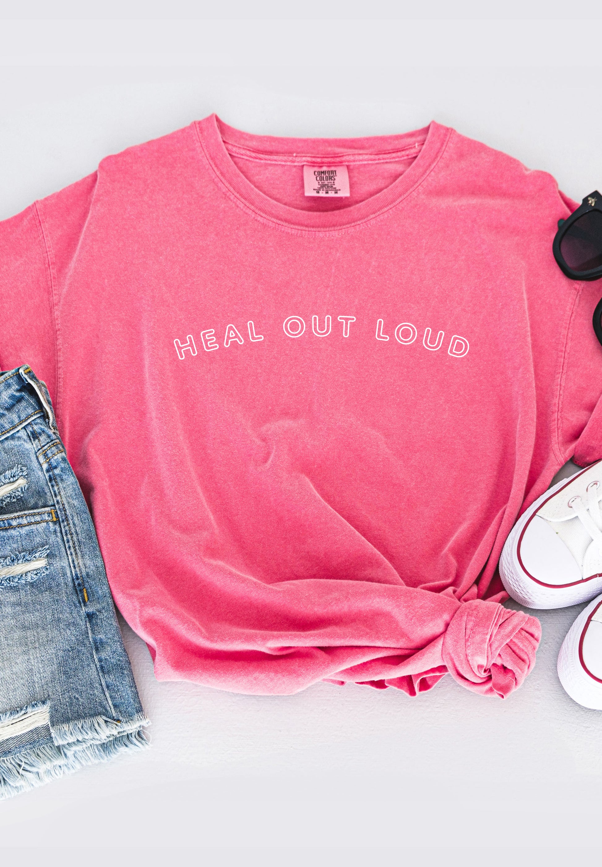 Experience a vibrant vintage feel with our Heal Out Loud Watermelon Tee. This pigment dyed t-shirt features a relaxed unisex fit and a refreshing watermelon color. The front boasts our powerful "Heal Out Loud" print, while the back has a large print reminding you to never suffer in silence.