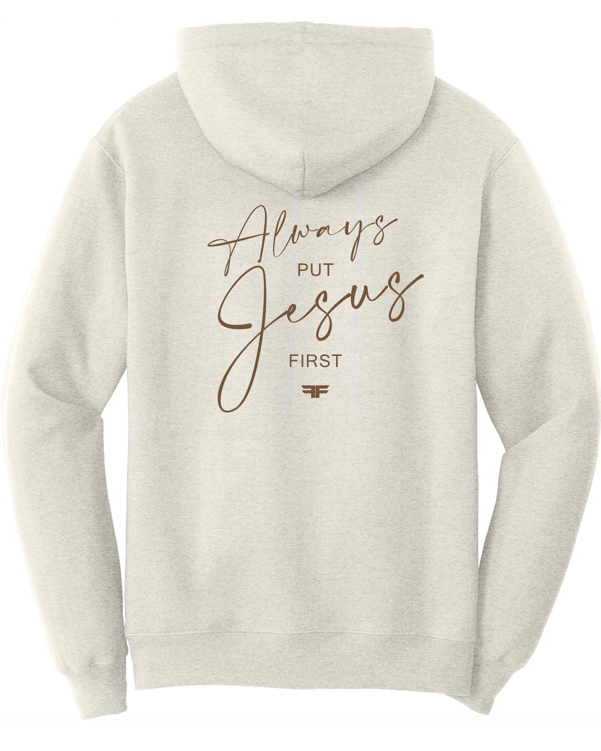 This oatmeal hoodie features center front "I am second" print and large "Always put Jesus first" print on the back. With functional drawstrings, front pocket, and fleece lining, this unisex hoodie provides both style and comfort. Show your faith while staying warm in this versatile and fashionable piece.