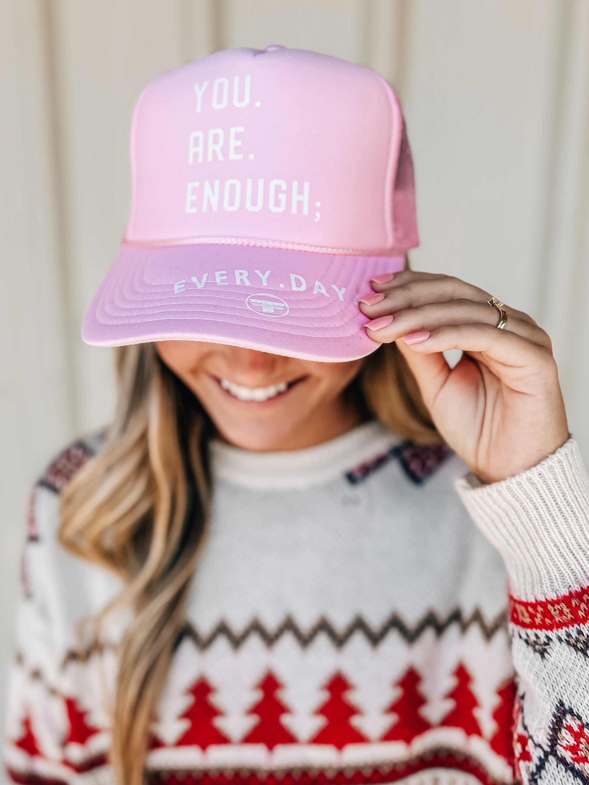 Foam front trucker hat with adjustable snap back and rope front detail. With our "You are Enough;" print on cap front and "everyday." on the side bill.